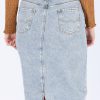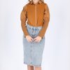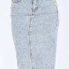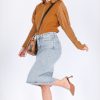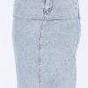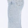 מגה-טרנדי: חצאית ג’ינס בגזרה היושבת גבוה על המותן בשילוב אלכסוני עם סיומת פרומה,